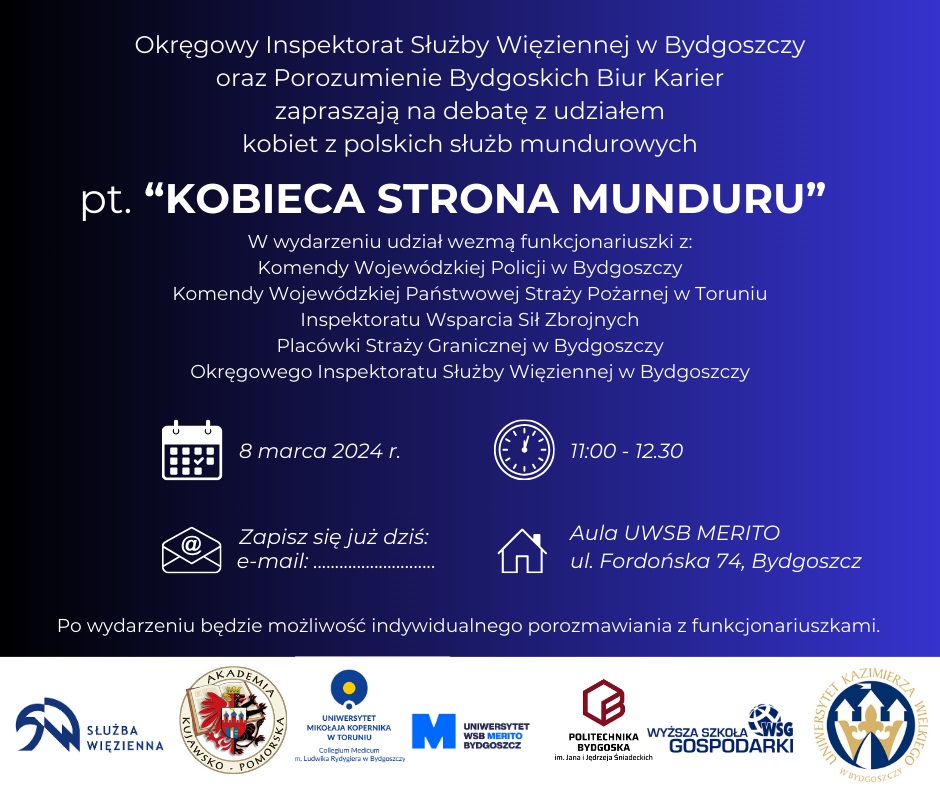 Biuro Karier Politechniki Bydgoskiej wraz z pięcioma uczelniami z Porozumienia Bydgoskich Biur Karier oraz Okręgowym Inspektoratem Służby Więziennej w Bydgoszczy zaprasza 8 marca 2024 r. o godzinie 11:00 na wyjątkową debatę z udziałem przedstawicielek polskich służb mundurowych pt. „Kobieca strona munduru”. Miejsce - Uniwersytet WSB Merito Bydgoszcz ul. Fordońska 74.