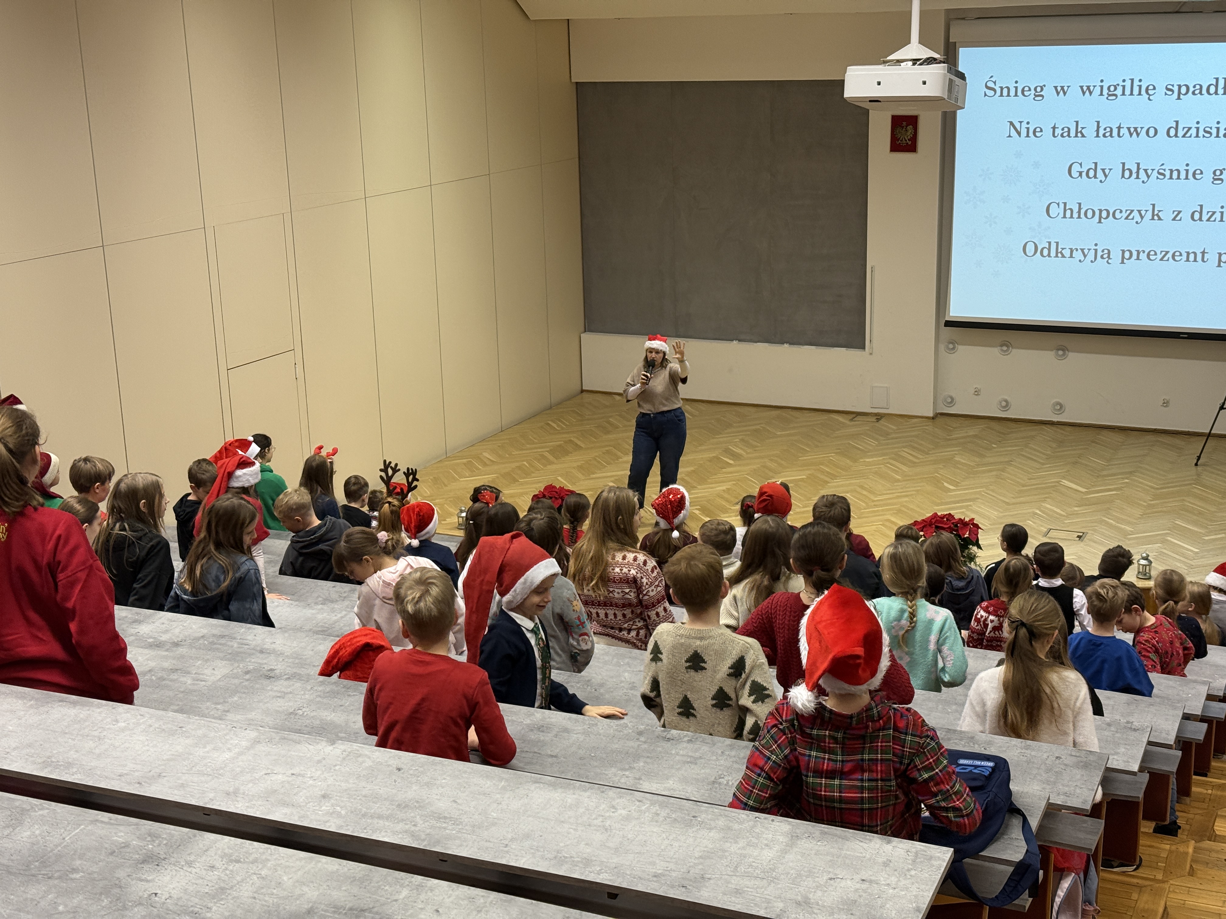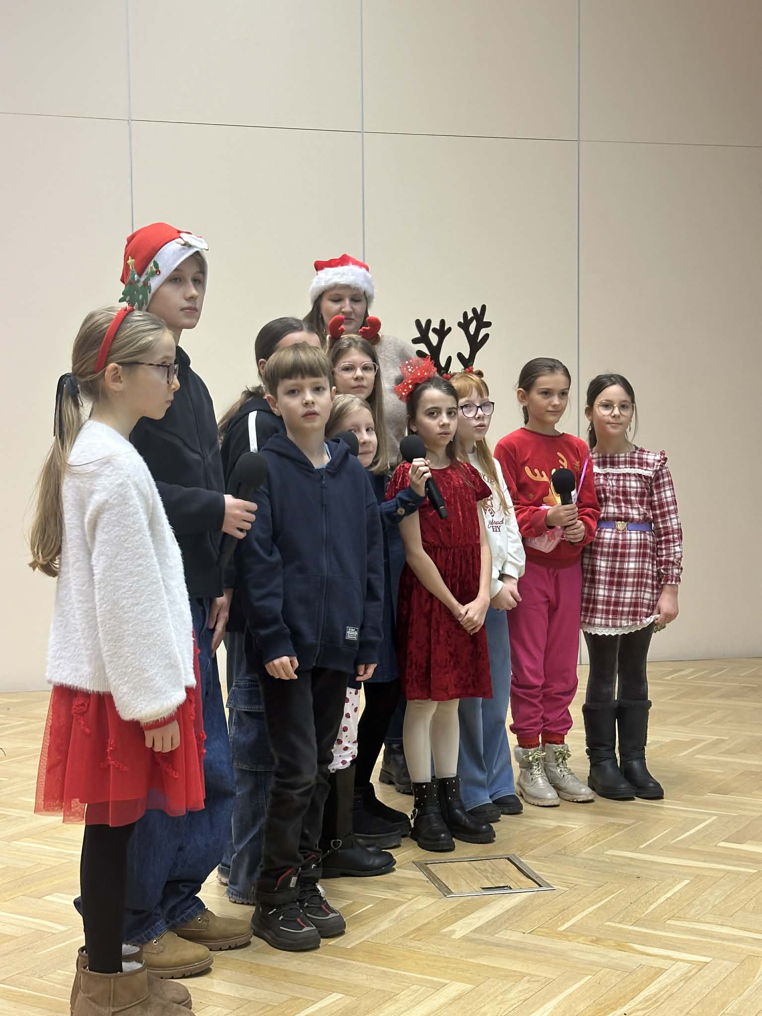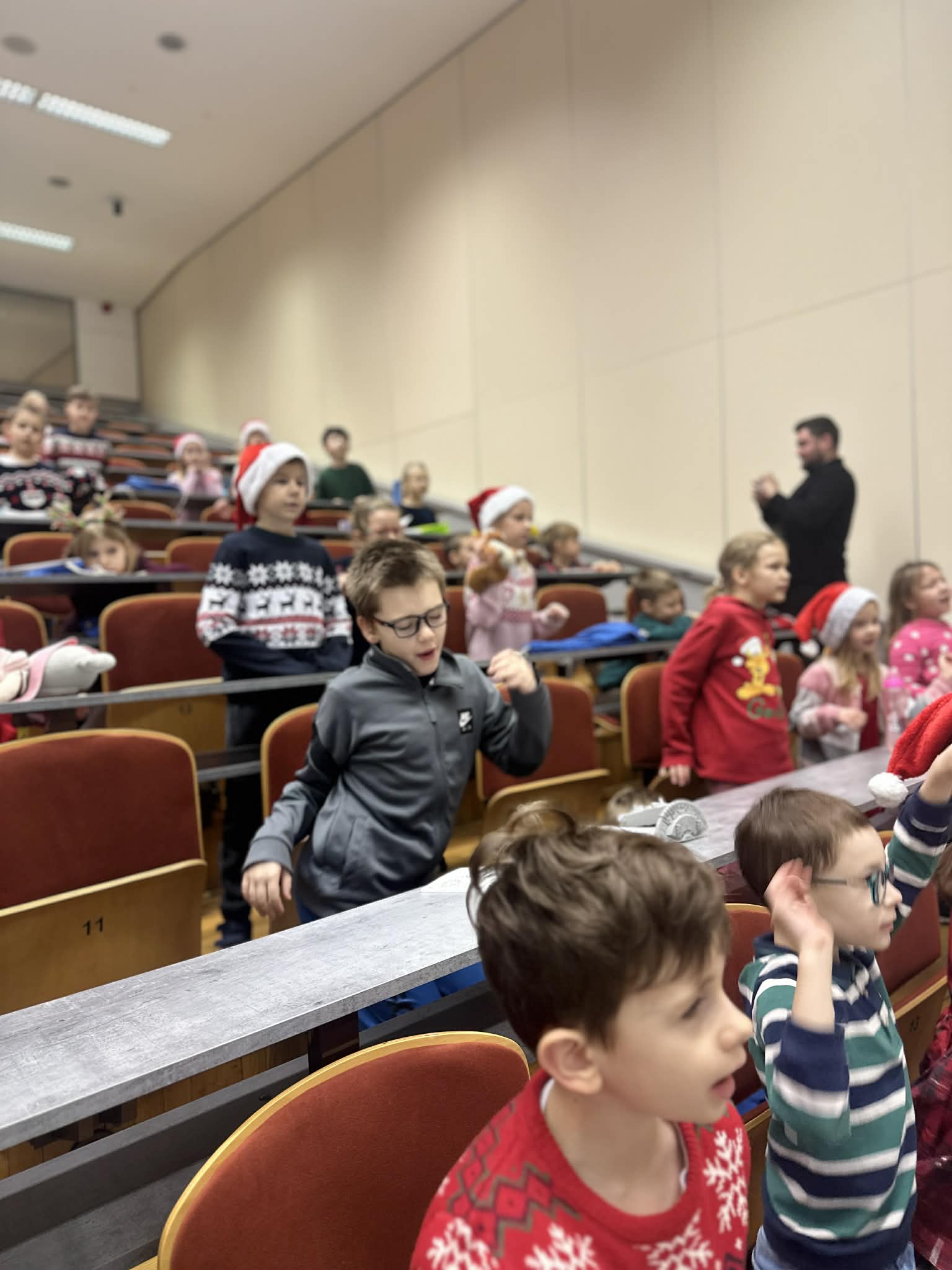 Na początku rozgrzewka, czyli seria śmiesznych ćwiczeń, które pomogły nam przełamać lody i poczuć się pewnie na scenie. A potem… czas na śpiewanie! Nauczyliśmy się wyjątkowego utworu świątecznego w specjalnej, mega szybkiej aranżacji, takiej, żeby nawet Święty Mikołaj był zaskoczony!